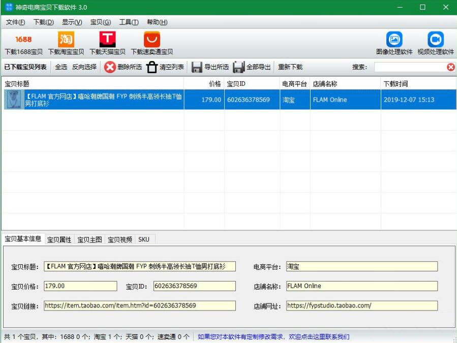 5、最后,神奇电商宝贝下载软件将淘宝宝贝图片下载完成了,我们就可以在界面中看到该宝贝的详情信息、包括它的价格、ID、店铺名称、下载时间等等。