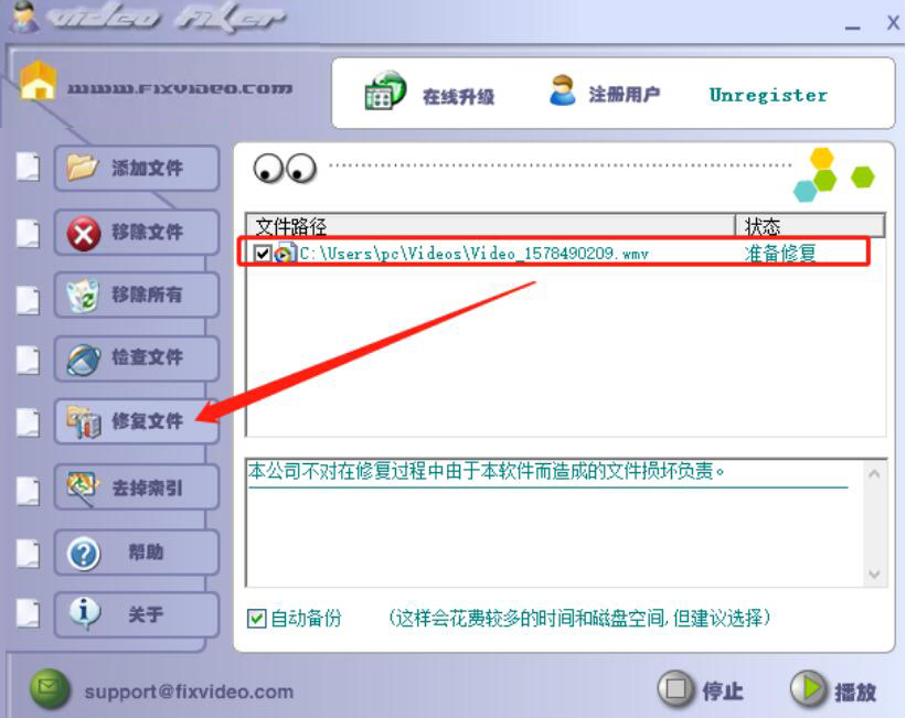 3、接下来,我们可以看到刚才导入的视频已经默认被勾选,我们直接点击界面左侧的“修复文件”按钮,FixVideo便开始修复视频。