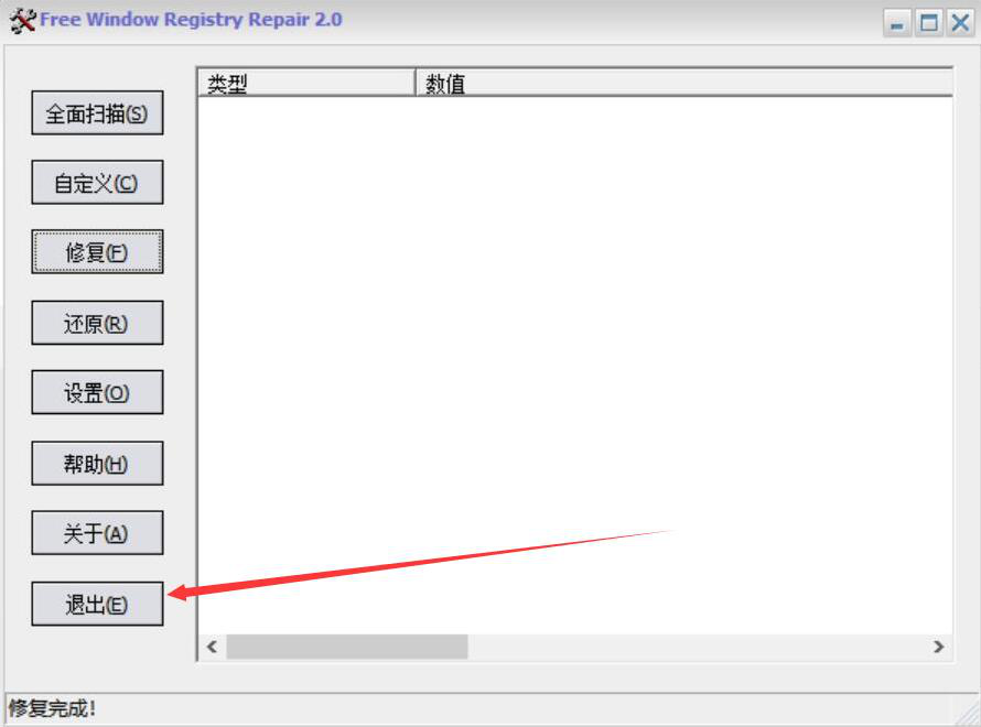 5、最后,界面左下方显示“修复完成”,说明Free Window Registry Repair成功修复了所选的系统注册表文件,直接点击“退出”按钮即可。