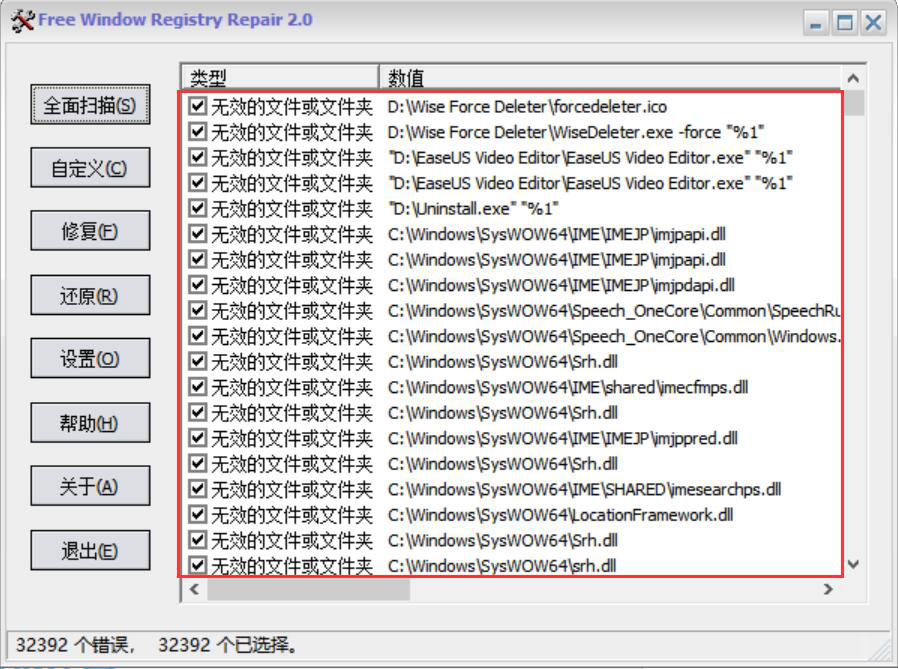 3、扫描完成,我们在Free Window Registry Repair界面中可以看到有哪些系统注册表文件是可以修复的。