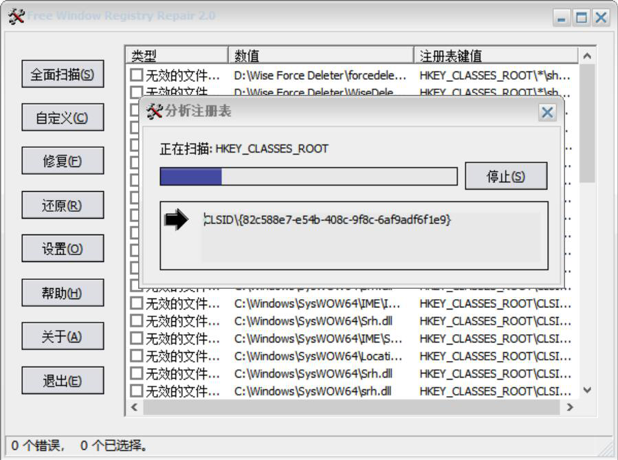 当系统注册表文件受损时,可能会导致系统或者某些软件无法正常运行,甚至出现闪退,我们可以用Free Window Registry Repair修复系统注册表文件。如果在分析系统注册表的过程中,将需要修复的注册表扫描出来了,就可以停止扫描,直接修复。