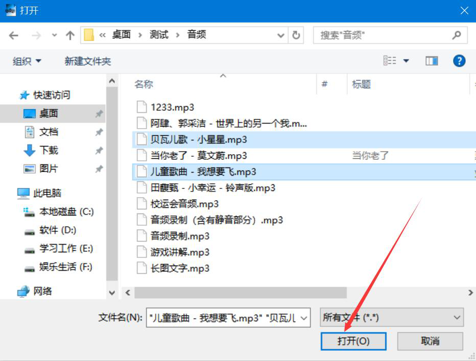 2、然后,在弹出的窗口中,我们选择需要合并的MP3音频,并点击“打开”按钮,将其导入MP3合并器。