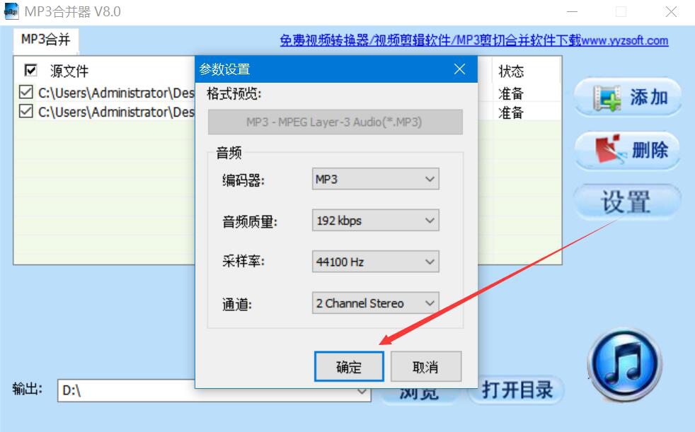 4、此时,MP3合并器会弹出参数设置窗口,我们可以根据自己的个性化需要设置音频质量等等,设置好后,点击“确定”按钮。