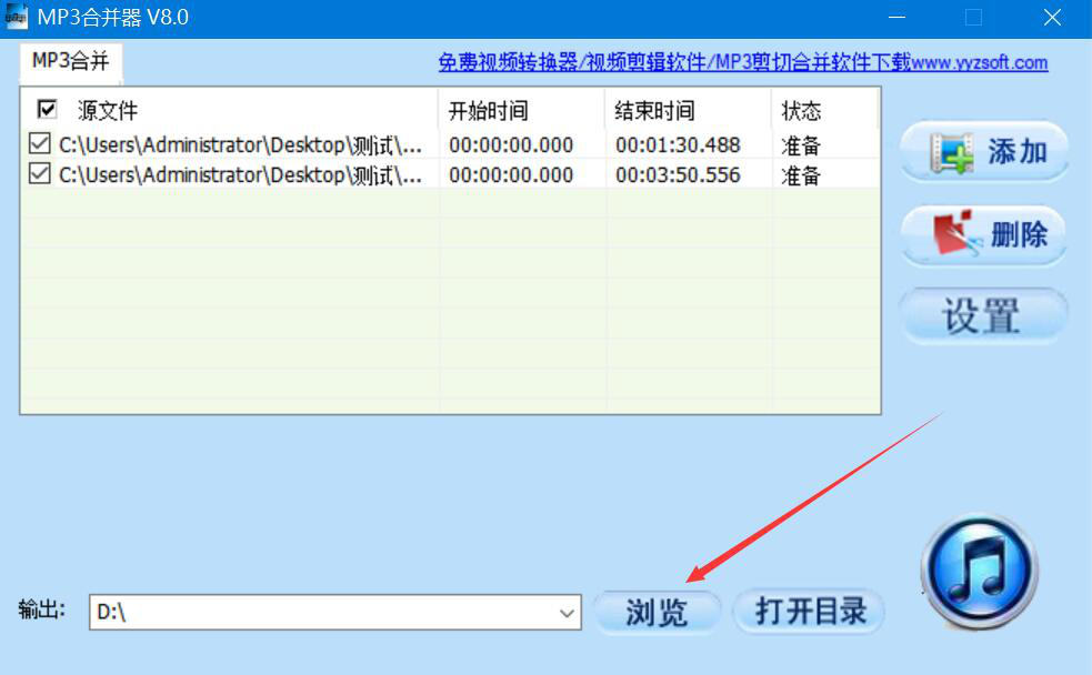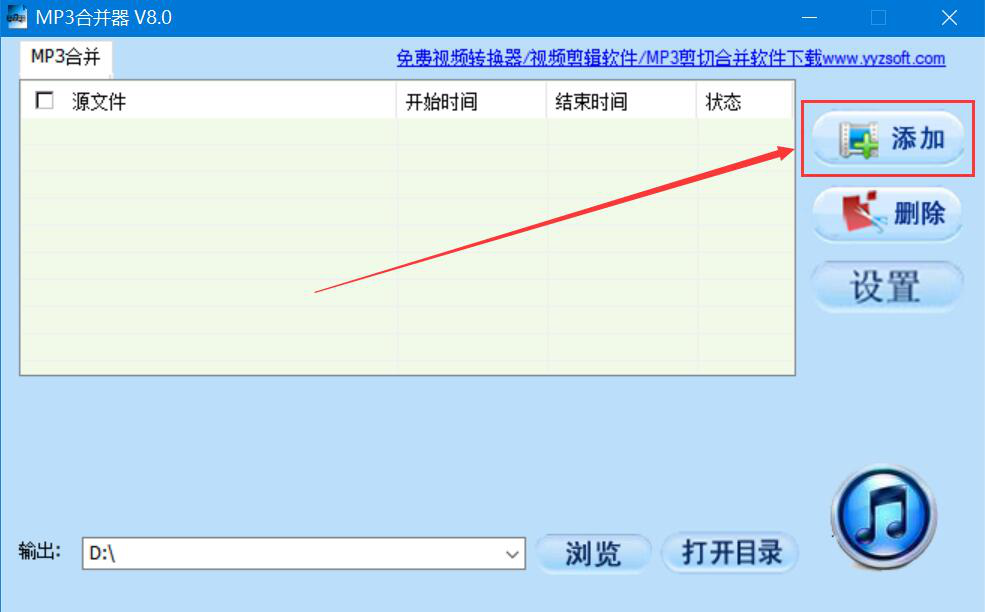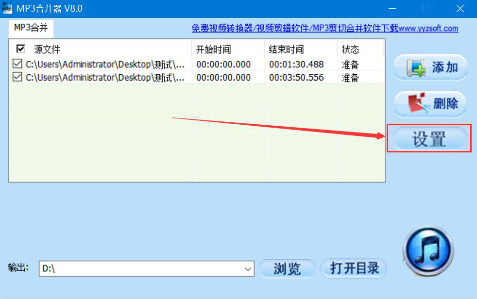 3、回到MP3合并器操作界面,我们点击界面右侧的“设置”按钮。