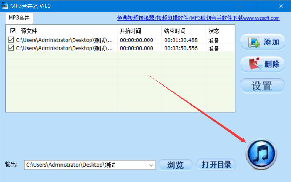7、最后,我们点击界面右下方的音符按钮,MP3合并器便开始合并MP3音频。