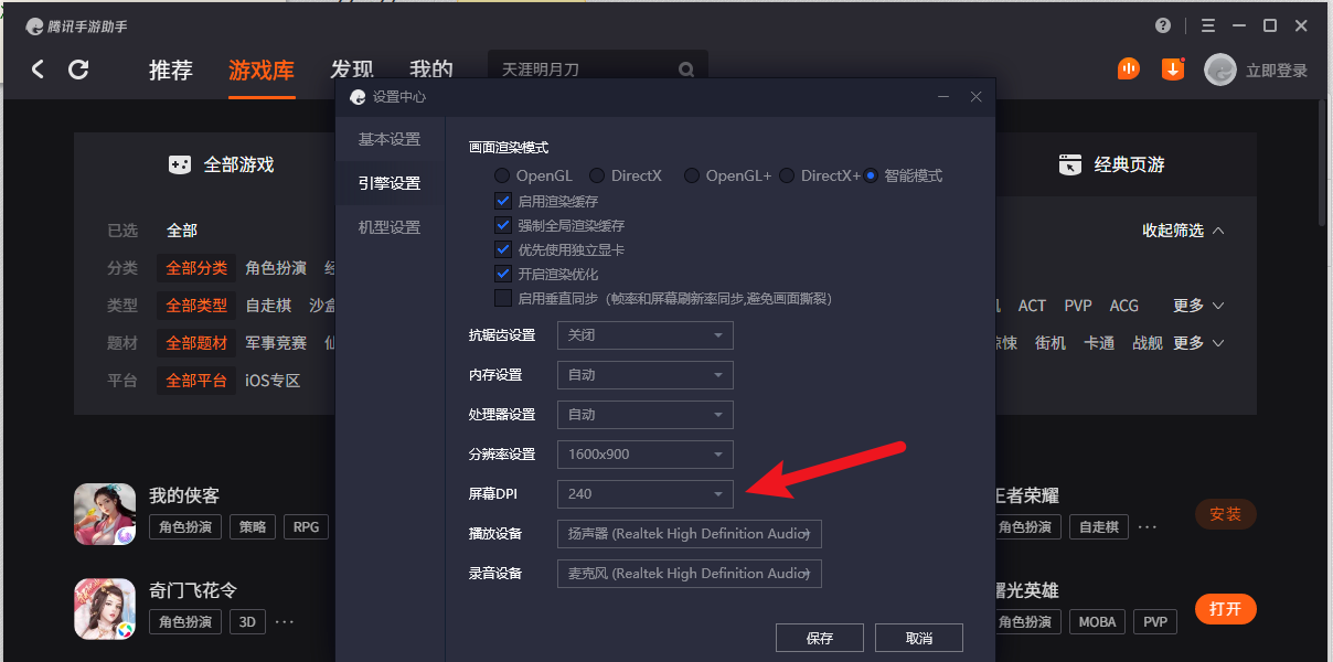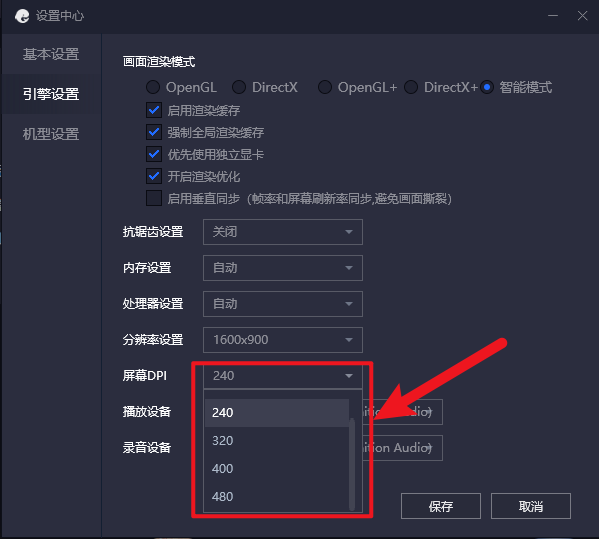 进入设置中心,在左侧栏点击【引擎设置】,选择【屏幕DPI】,在下拉菜单中设置数值,最后点击保存。
