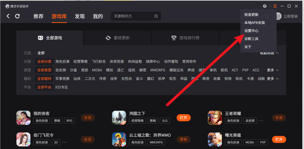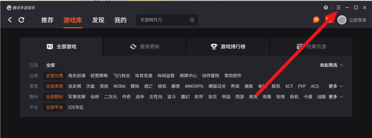 打开腾讯手游助手,登录账号,进入软件界面,点击右上角的主菜单图标,