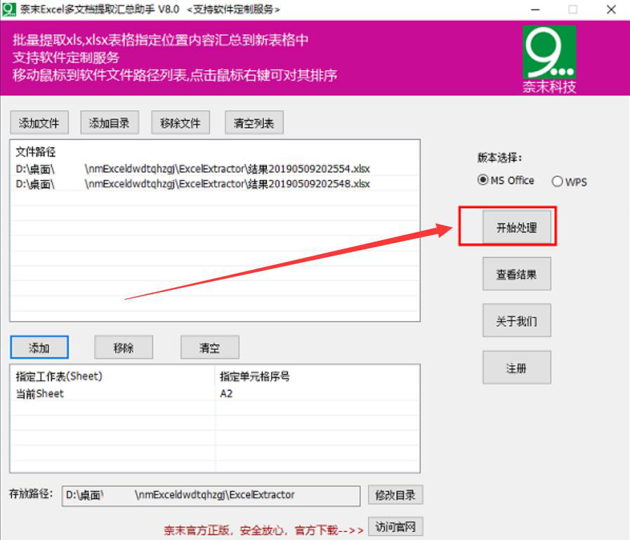 6、最后,我们点击界面右侧的“开始处理”按钮,奈末Excel多文档提取汇总助手便开始汇总Excel文件。