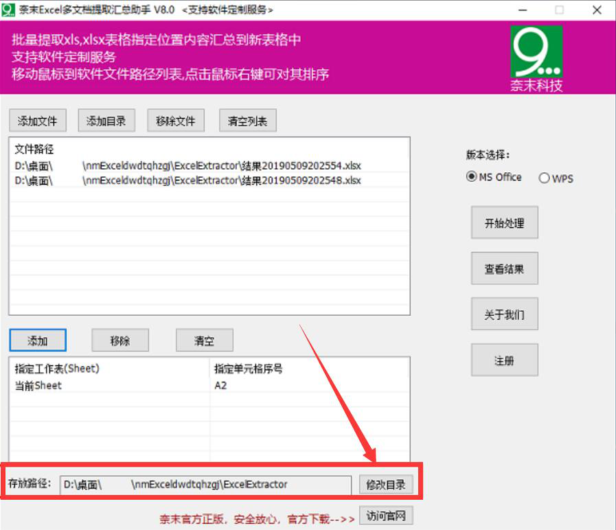5、如果Excel文件汇总后的存放路径需要修改,我们就点击奈末Excel多文档提取汇总助手界面下方的“修改目录”按钮来设置。