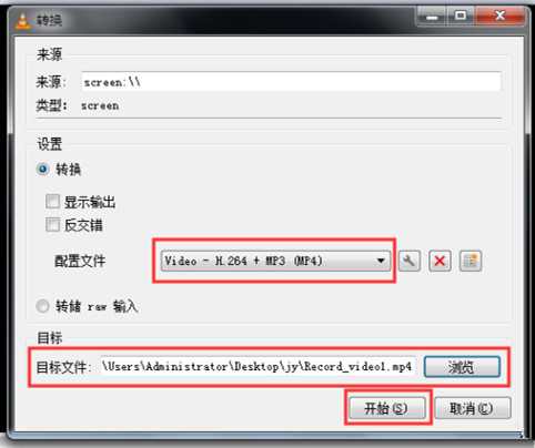 3、进入转换窗口,如图,点击【配置文件】,选择【Video - H.264 + MP3(MP4)】,即设置录制的视频格式;点击【浏览】按钮,设置目标文件保存路径,然后点击【开始】,VLC会自动最小化,此时就能进行视频录制,屏幕中的任何操作都会被录下来,
