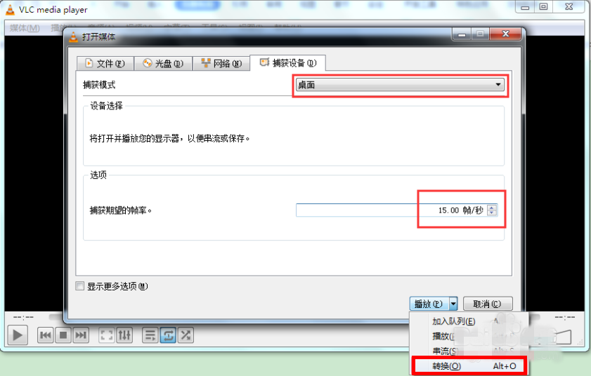 2、弹出窗口,如图,点击【捕获模式】的右侧下拉菜单,选择桌面,设置【捕获期望的帧率】为15.00帧/秒,然后点击【播放】下拉列表,选择【转换】,