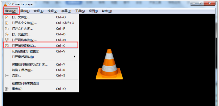 1、打开VLC Media Player播放器,进入界面,在菜单栏点击【媒体】——【打开捕获设备】,
