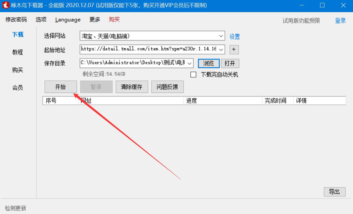 6、淘宝图片下载后的保存路径设置好了,我们点击啄木鸟全能下载器界面的“开始”按钮。