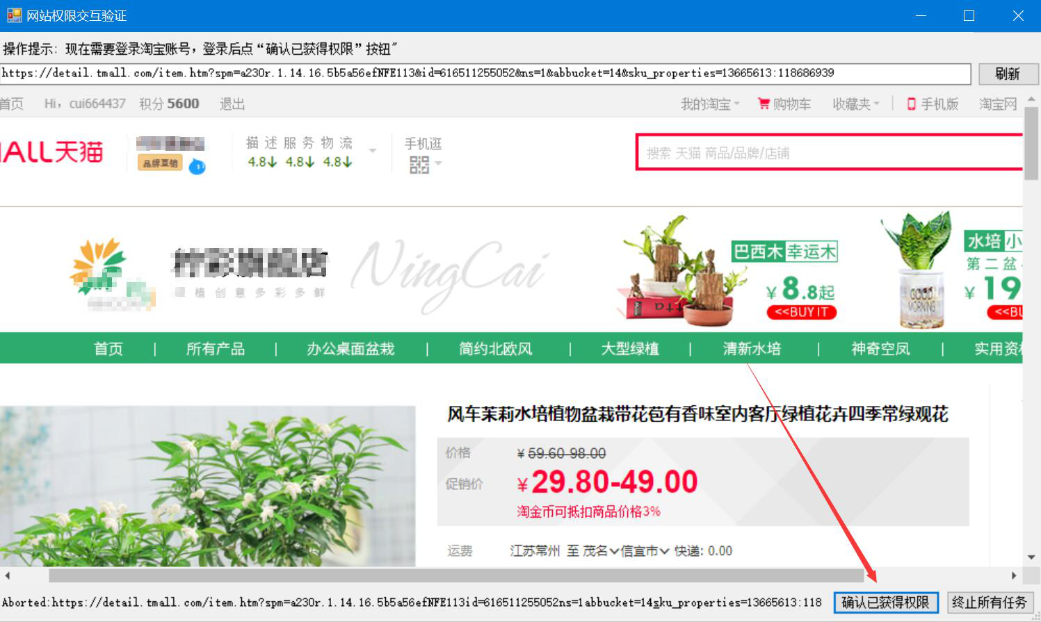 7、此时,啄木鸟全能下载器便会自动跳转至网站权限交互验证的页面,也就是该商品图片对应的商品详情页,我们登录淘宝账号后,就点击页面右下方的“确认已获得权限”按钮。啄木鸟全能下载器便开始下载淘宝图片。