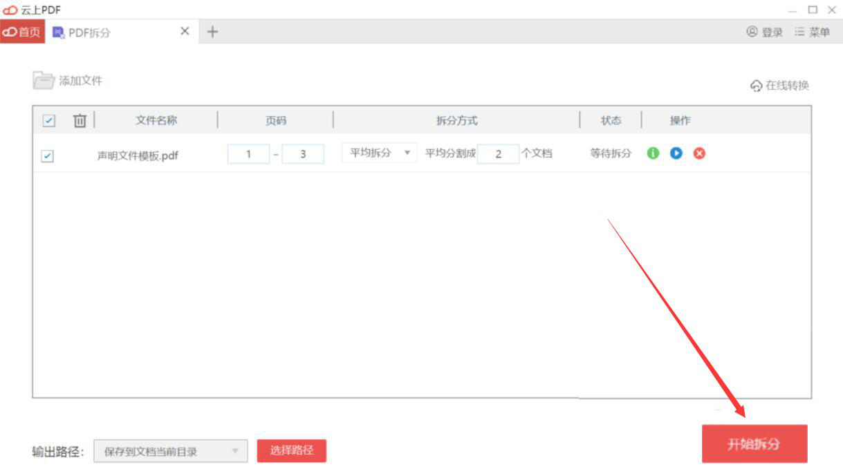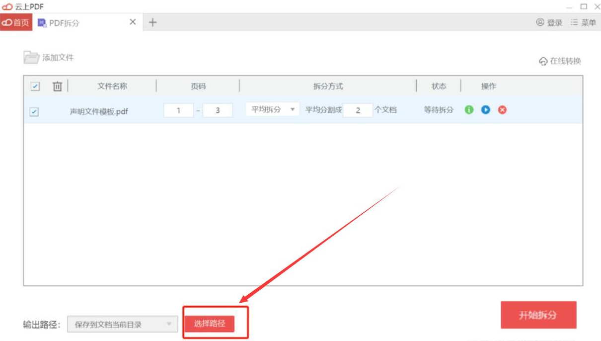 3、如果不愿意PDF文件拆分后输出到文档当前目录,就点击云上PDF软件界面下方的“选择路径”按钮。