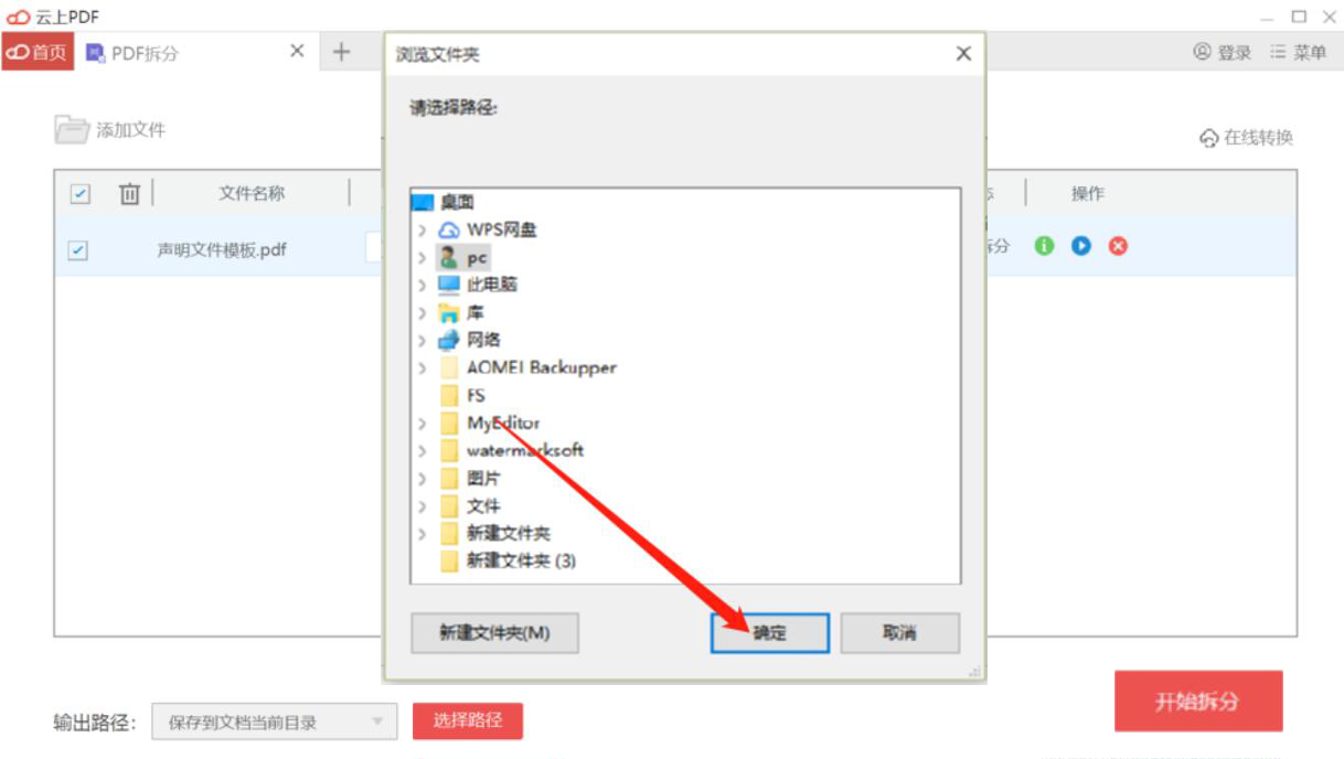 4、接下来,云上PDF软件会弹出浏览文件夹窗口,我们选择PDF文件拆分后的保存路径,再点击“确定”按钮。