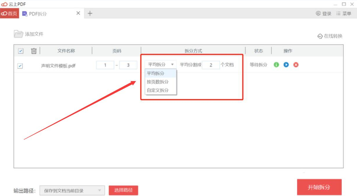 5、输出路径设置好了,我们根据自己的需要选择PDF文件拆分的方式。它有平均拆分、按页数拆分和自定义拆分这三种方式。例如,这里,我们选择平均拆分,将PDF文件拆分为2份。
