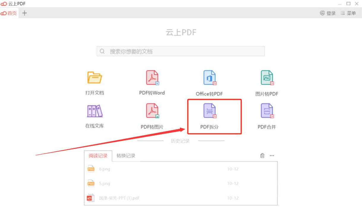 1、首先,我们打开云上PDF软件,在其向导界面中点击“PDF拆分”功能项目。