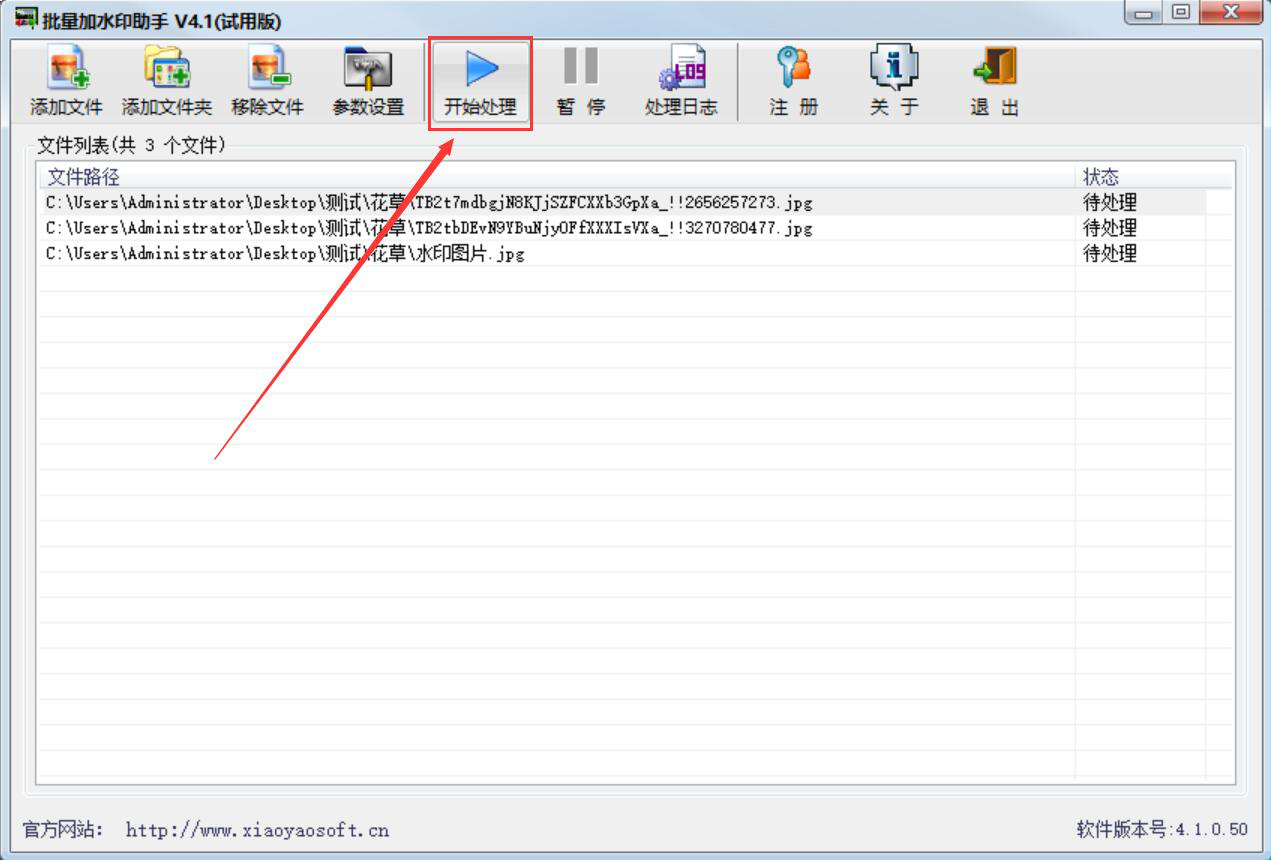 7、接着,我们点击菜单栏中的“开始处理”按钮,批量加水印助手便开始给图片批量添加水印。