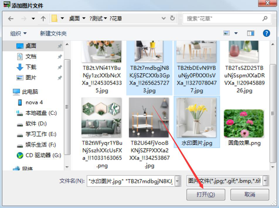 2、在弹出的窗口中,将需要批量添加水印的图片一并选中,并点击“打开”按钮,将其导入批量加水印助手。