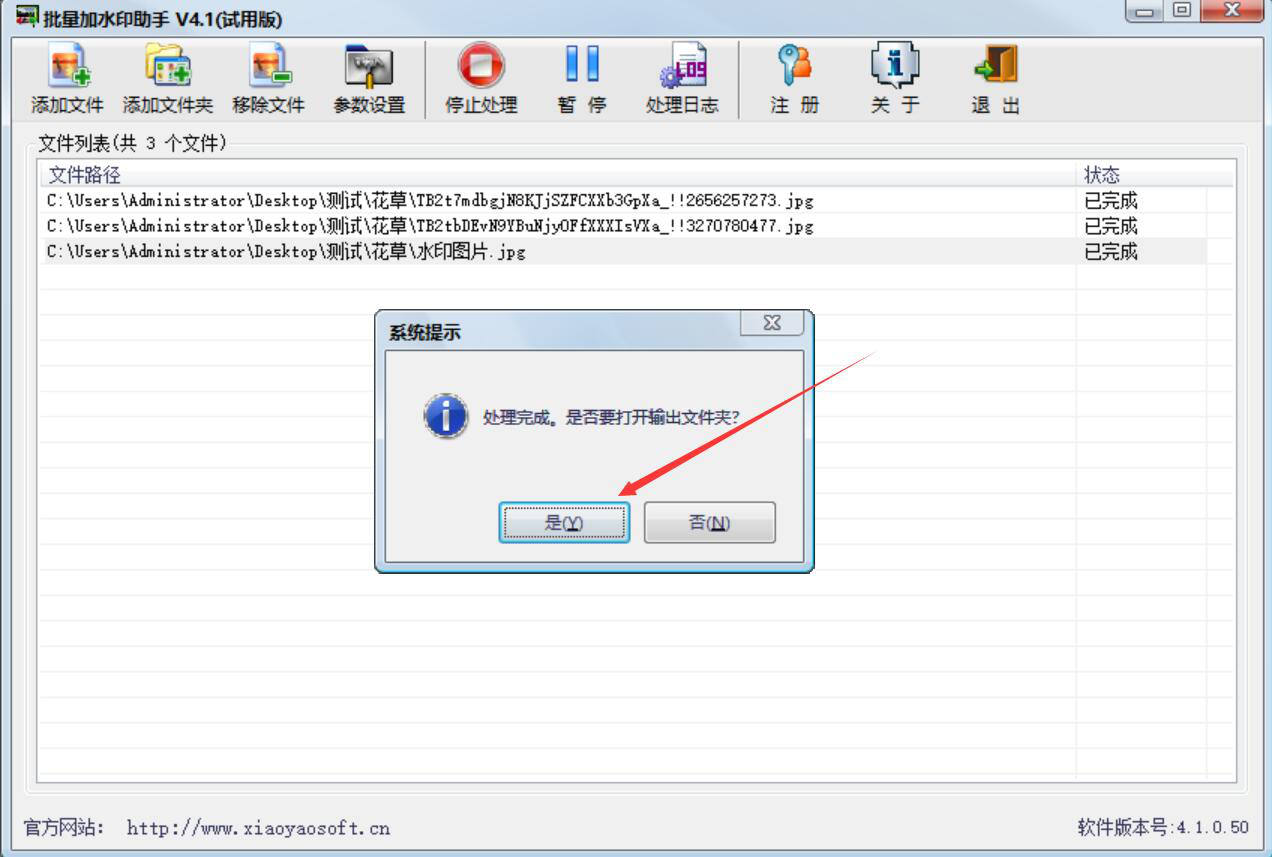 8、最后,弹出如下图的系统提示窗口,说明批量加水印助手成功地给图片批量添加了水印。我们直接点击“是”按钮即可打开处理好的图片。