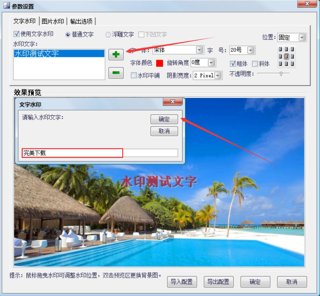 4、进入批量加水印助手的参数设置界面,我们切换至“文字水印”选项卡,点击“+”按钮,便会弹出文字水印窗口,我们输入想要为图片批量添加的水印内容,再点击“确定”按钮。
