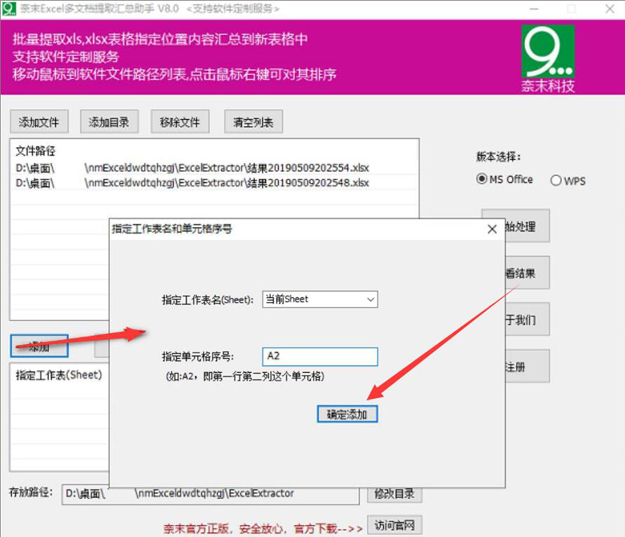 4、此时,奈末Excel多文档提取汇总助手便会弹出如下图窗口。我们先根据自己的需要设置前指定工作表名和指定单元格序号来汇总Excel文件,再点击“确定添加”按钮。