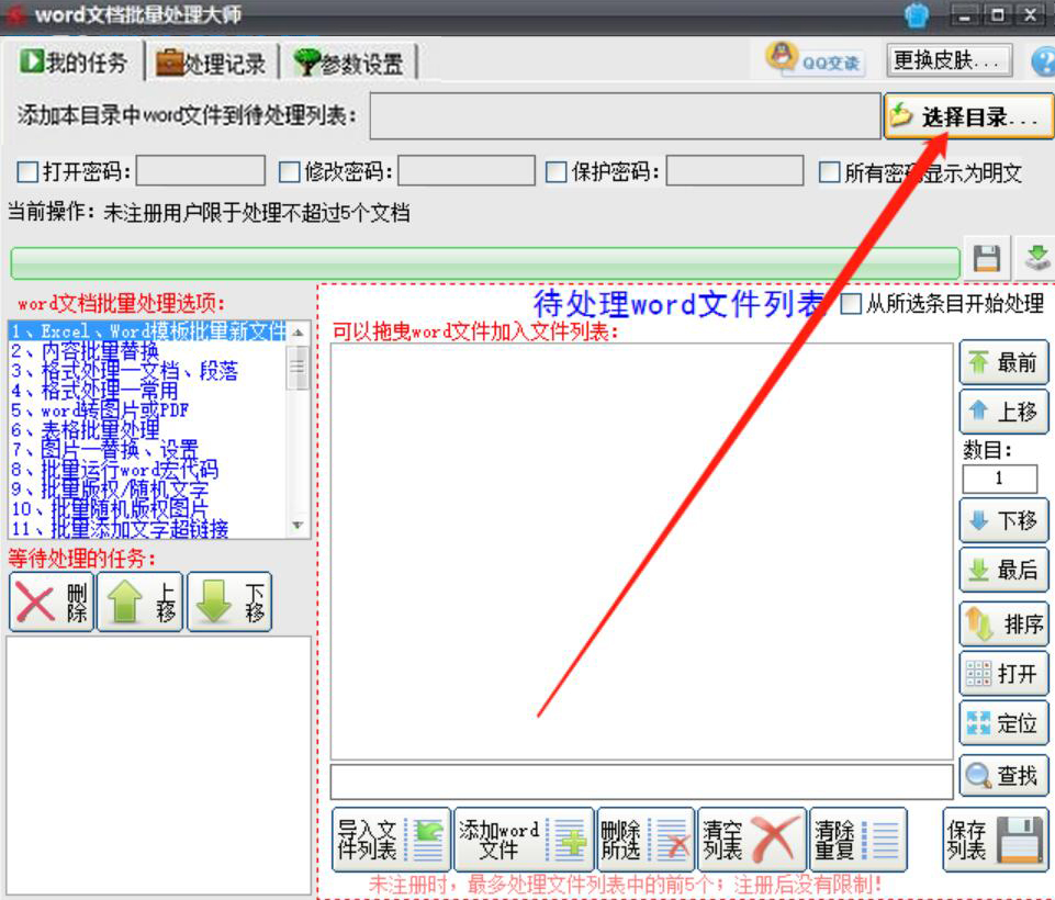 1、首先,我们打开Word文档批量处理大师,点击界面右上方的“选择目录”按钮。