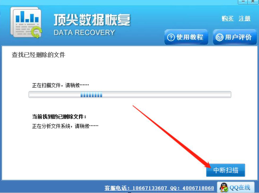 2、然后,顶尖数据恢复软件便开始扫描回收站中已经清空的文件,如下图所示。如果想停止扫描,就点击“中断扫描”按钮。
