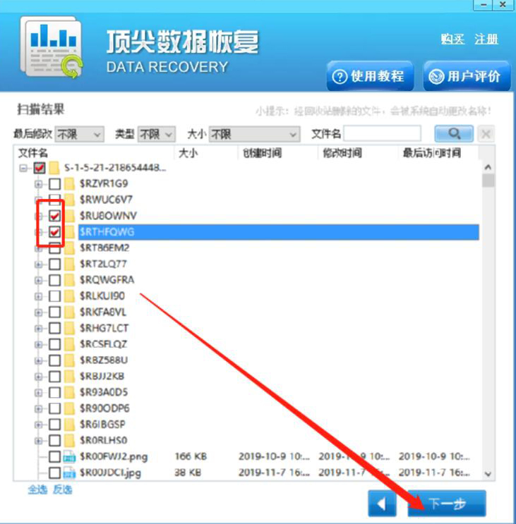 3、接下来,扫描完成了,我们在顶尖数据恢复软件界面中,勾选自己想要恢复的的回收站文件,再点击“下一步”按钮。