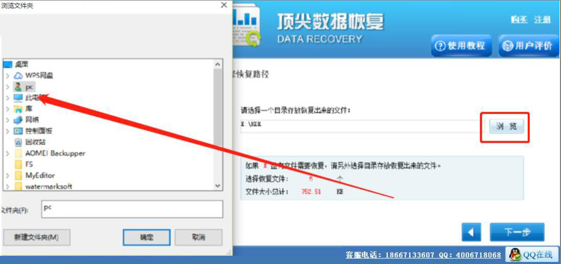 4、此时,顶尖数据恢复软件便会弹出浏览文件夹窗口,我们选择回收站文件恢复后的保存路径,再点击“确定”按钮。