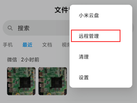 首先确保小米手机和电脑连接了同一WiFi,然后打开手机自带的文件管理器功能,如图,点击右上角的按钮,选择【远程管理】,
