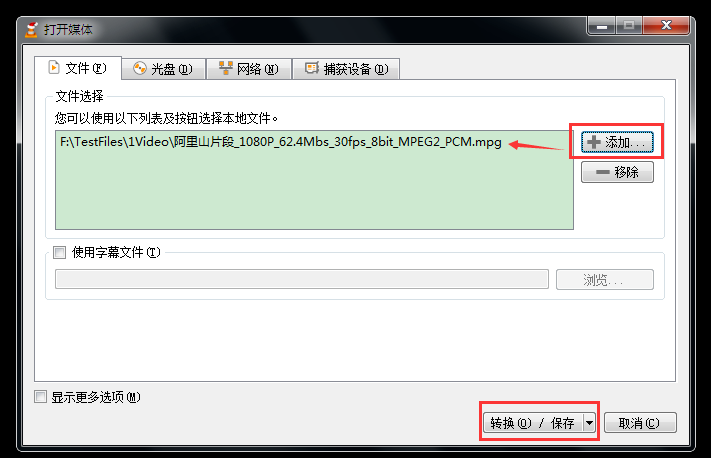 进入【打开媒体】弹窗,点击【文件】选项卡,点击【+添加】按钮,选择源视频,然后点击下方的【转换/保存】,