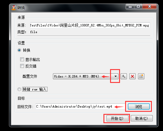 进入转换页面,点击【配置文件】下拉菜单,选择转换的目标格式,我选择的是H.264 MP3格式;点击【浏览】按钮,选择转换后的视频的保存路径,然后点击【开始】,