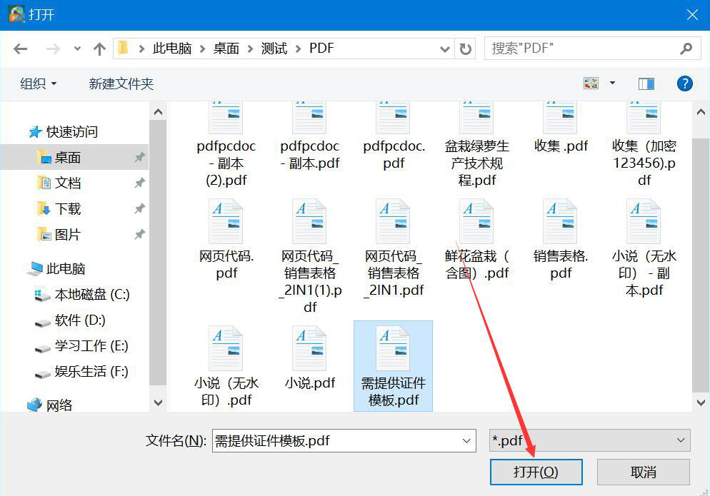 2、然后,在弹出的窗口中,我们将需要移除密码的PDF文件选中,并点击“打开”按钮,将其导入PDF Password Remover软件。