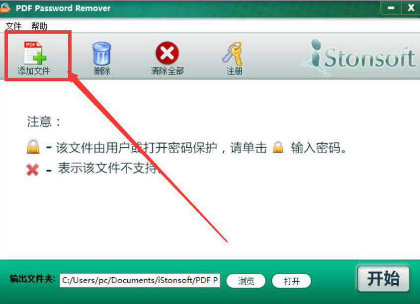 1、首先,我们打开PDF Password Remover软件,点击界面左上方的“添加文件”按钮。