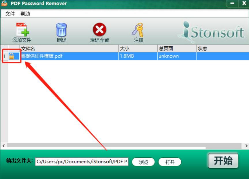 3、接下来,我们在PDF Password Remover界面中,点击文件列表中的密码锁图标按钮。