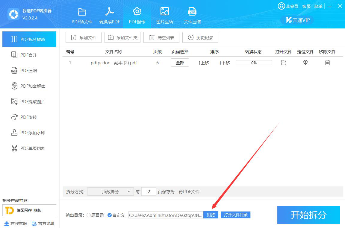 5、如果PDF文件拆分后的输出目录需要更改,就点击我速PDF转换器界面下方的“浏览”按钮。