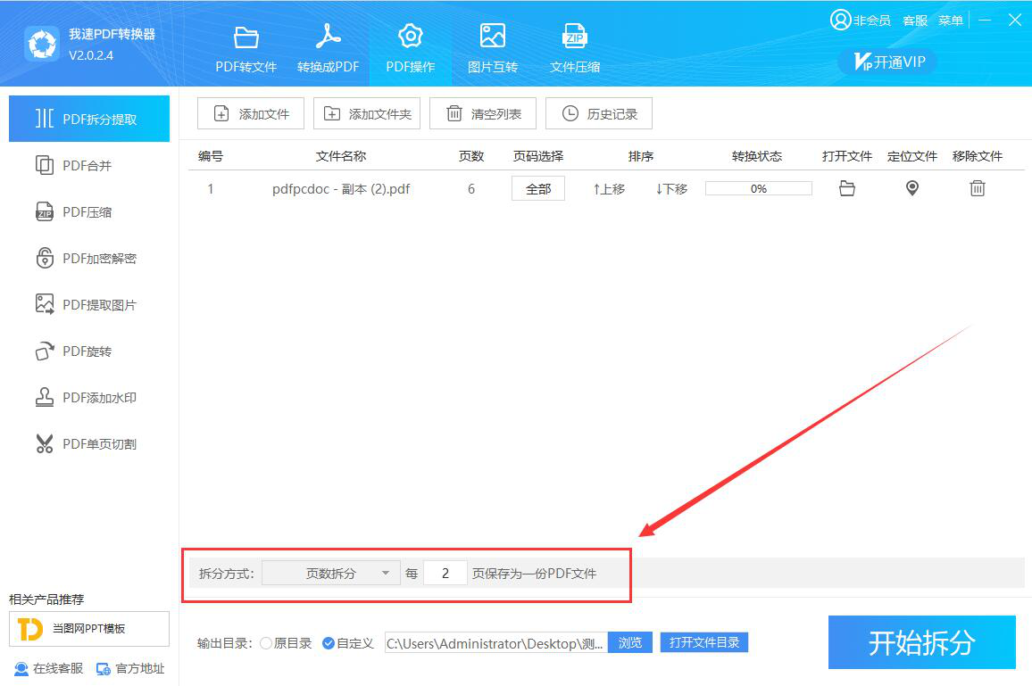 4、例如,这里,我们选择的是按页数拆分,并设置每2页就保存为一个PDF文件。这样阅读起来就不会感觉那么有压力了。