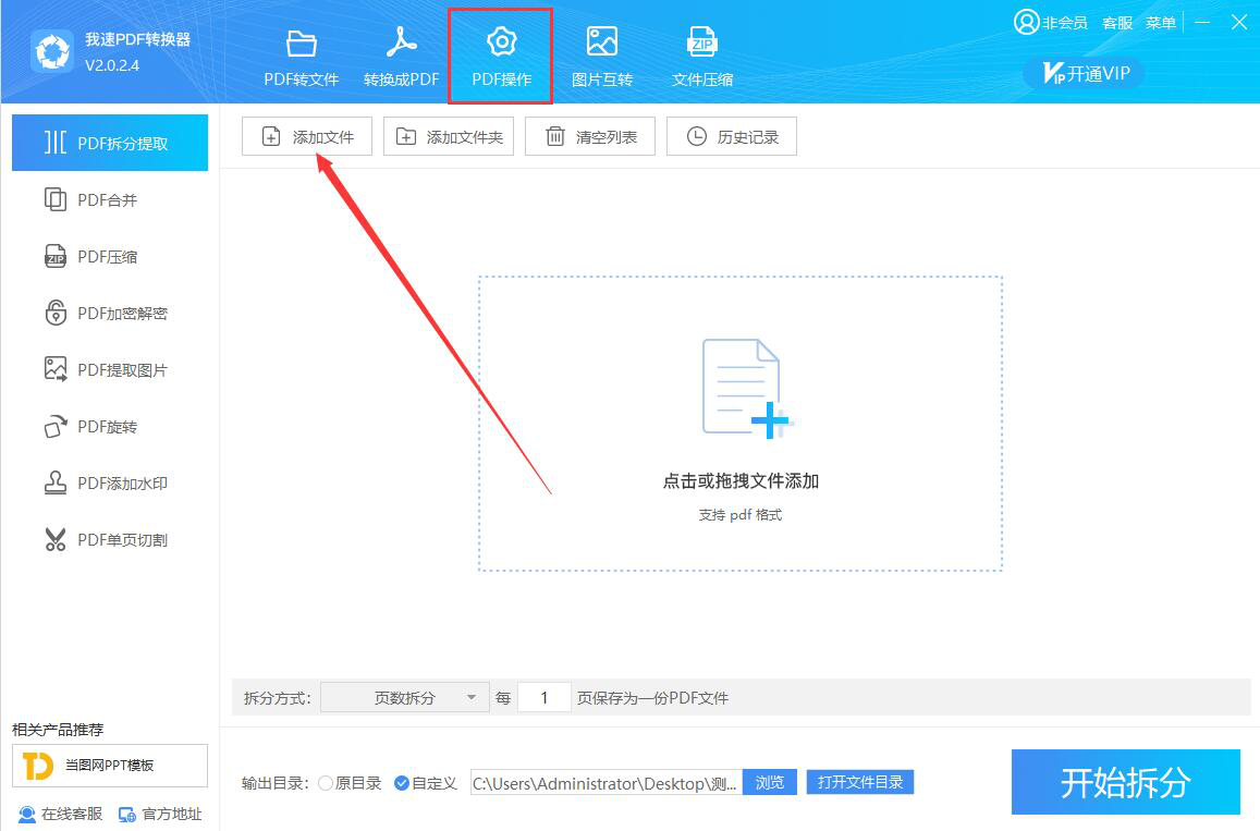 1、首先,我们打开我速PDF转换器,切换至“PDF操作”中的“PDF拆分提取”操作界面,并点击“添加文件”按钮。