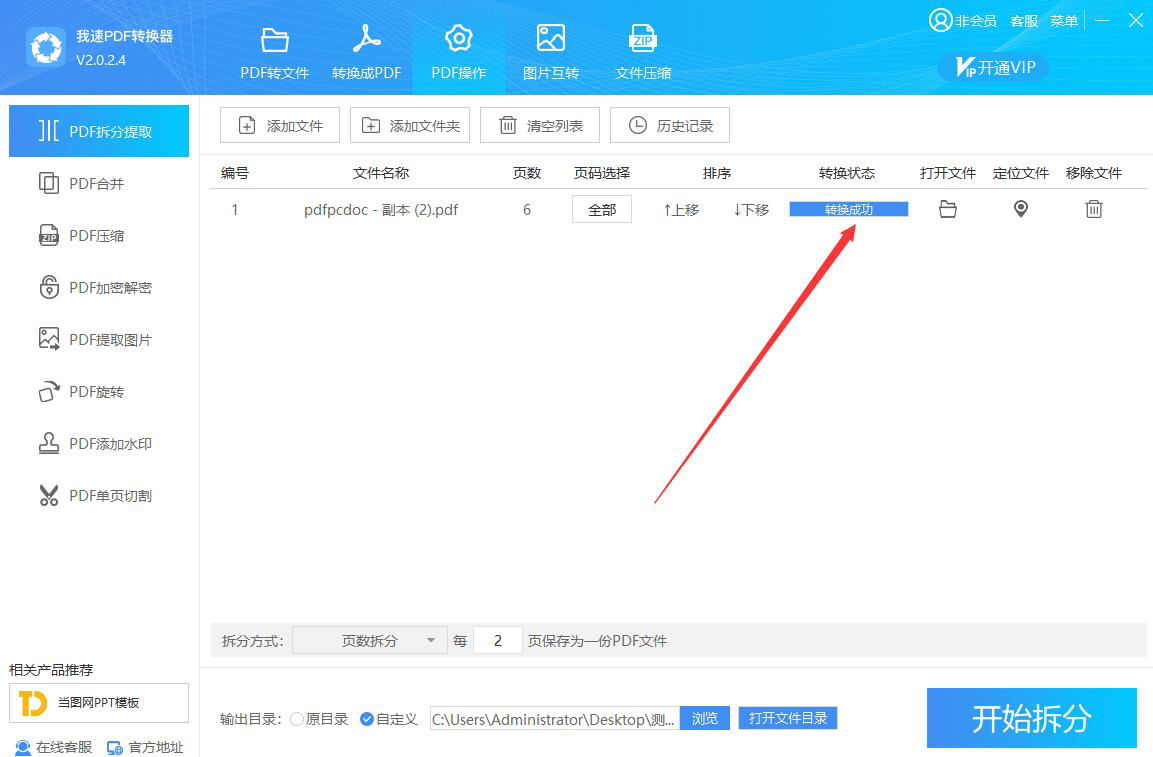 8、最后,当转换状态显示“转换成功”,则说明我速PDF转换器成功地拆分了PDF文件并将文件保存起来了。