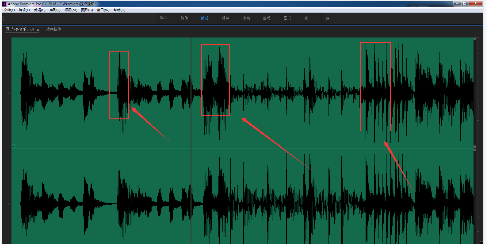 我们可以在项目窗口双击音乐素材,查看音乐的音频波形,如图,通过观察可以看到这段音乐有着明显的节奏区分,