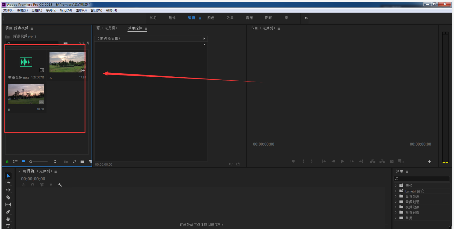 打开Adobe Premiere Pro软件,新建一个项目,导入事先准备的音乐素材和视频素材,如图,