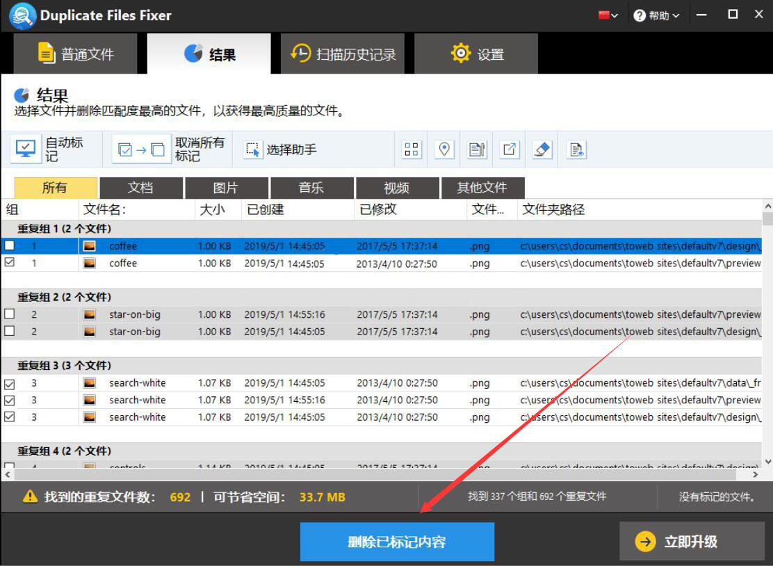 6、最后,在扫描结果中,我们勾选自己想要删除的重复文件,再点击“删除已标记内容”按钮,Duplicate Files Fixer便会一键删除重复文件。