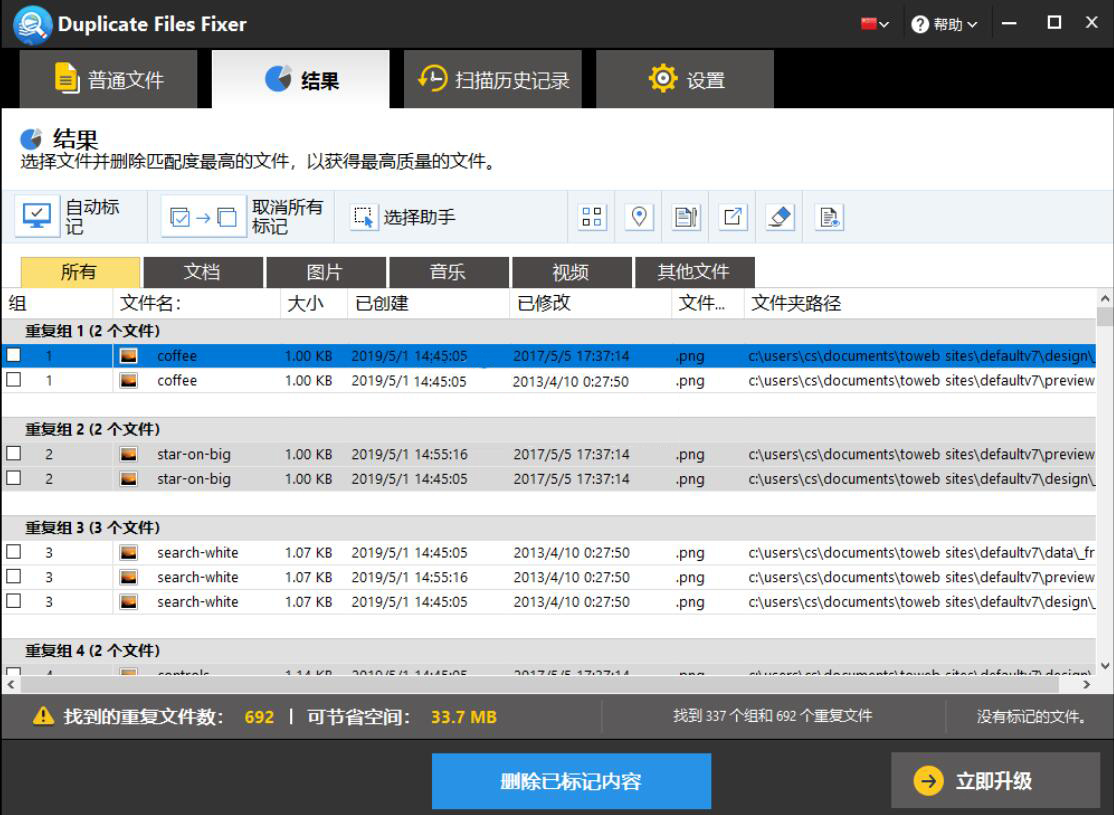 5、扫描完成,我们可以在Duplicate Files Fixer界面中看到所选文件夹中存在的所有重复文件。也可以选择只展示“文档”、“图片”、“音乐”、“视频”、“其他文件”中的某个类型文件。