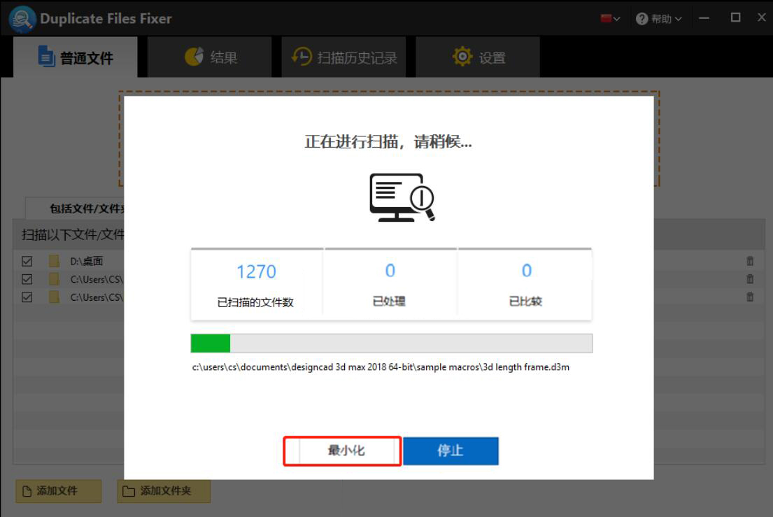 4、此时,我们可以在弹出的窗口中了解Duplicate Files Fixer扫描重复文件的进度,如果文件夹内容比较多,那么我们可以点击“最小化”,让它小窗口进行。