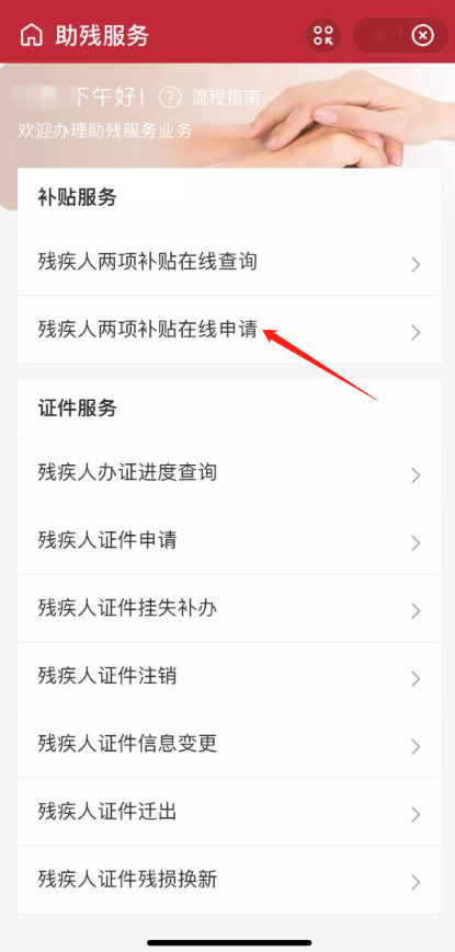 点击【残疾人证及补贴办理】服务,跳转页面,找到对应服务,查看相关说明,进行操作。成功办理之后,可以在线申请领取残疾人两项补贴。