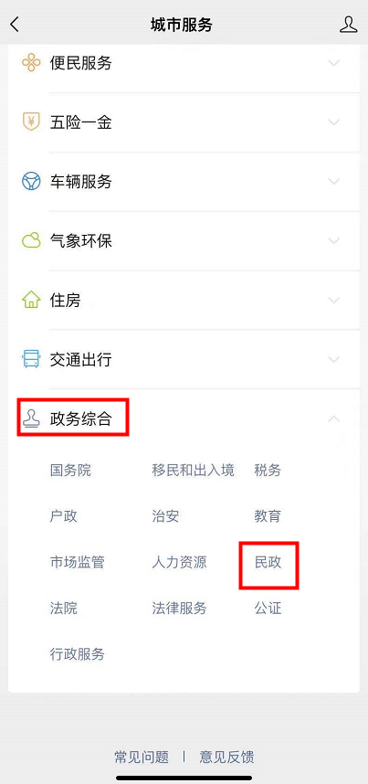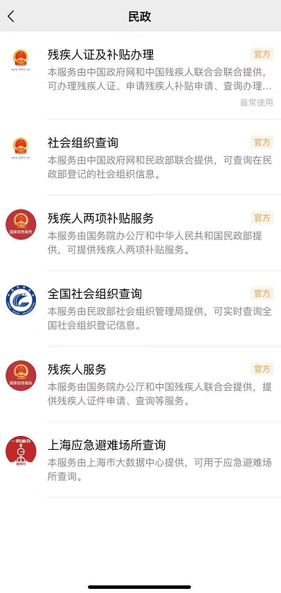 跳转窗口,如图,点击【政务综合】——【民政】,即可看到残疾人服务选项,