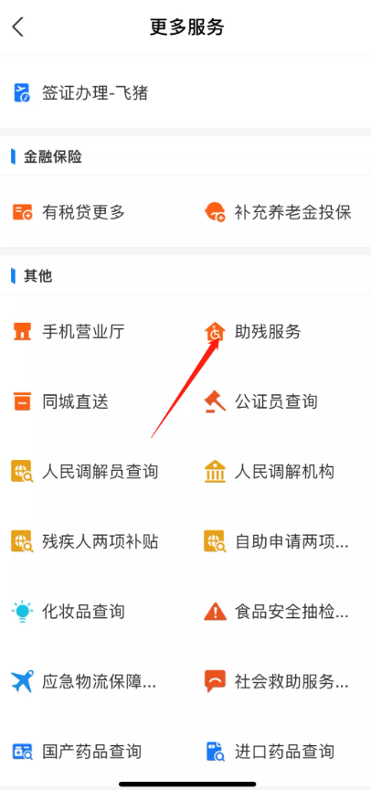 跳转页面,如图,点击【其他】——【助残服务】,