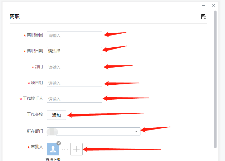 跳转界面,如图,填写你的离职信息,包括离职原因、离职日期、部门、项目组、工作接手人、工作交接附件、所在部门及审批人(也就是你的上司老板),点击右下角的【提交】按钮,